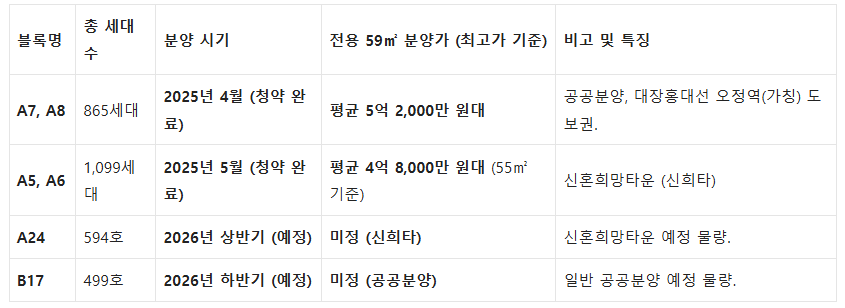 2-1. 부천 대장 지구 주요 블록별 확정 분양가 및 예정 일정 (59㎡ 기준)