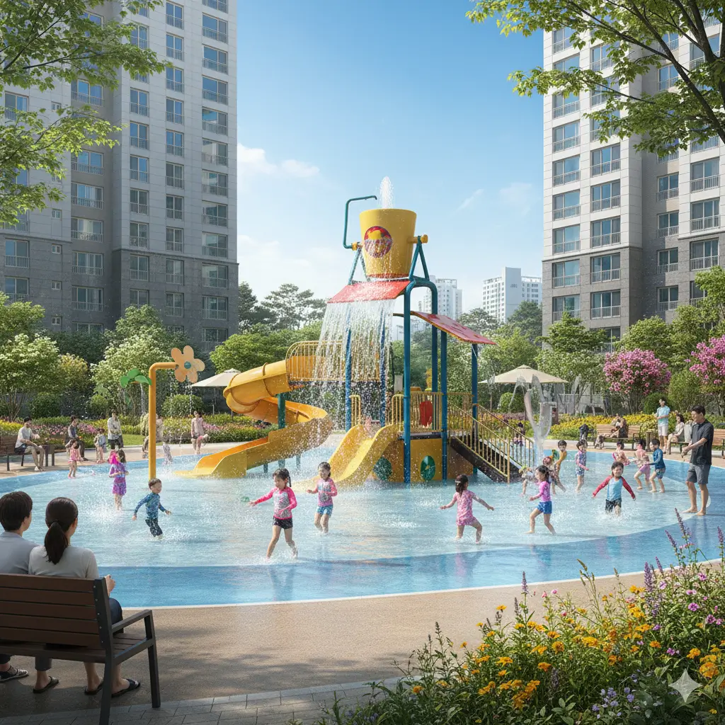 어린 자녀를 둔 신혼부부 및 젊은 가구의 유입을 결정하는 핵심 요소입니다. 단지 내에서 안전하게 아이들이 놀 수 있는 실내 키즈 카페와 함께, 여름철 단지 내에서 시원하게 즐길 수 있는 물놀이터(수경 시설)는 아이들의 만족도는 물론 부모의 육아 부담을 크게 줄여줍니다. 돌봄 센터나 국공립 어린이집 유치 여부도 아파트의 정주 여건을 대폭 개선하는 필수 조건입니다.