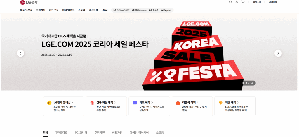 - LG전자: TV, 냉장고, 김치냉장고, 세탁기, 건조기 등 8개 대표 품목을 최대 38% 할인된 특가로 판매합니다. 또한 멤버십 앱 또는 베스트샵 홈페이지를 통해 17개 품목 대상 최대 116만 원 상당의 쿠폰팩을 제공하며, 대형 가전 구매 고객에게는 멤버십 포인트 추가 적립과 사은품 등 최대 500만 원 리워드를 제공합니다.